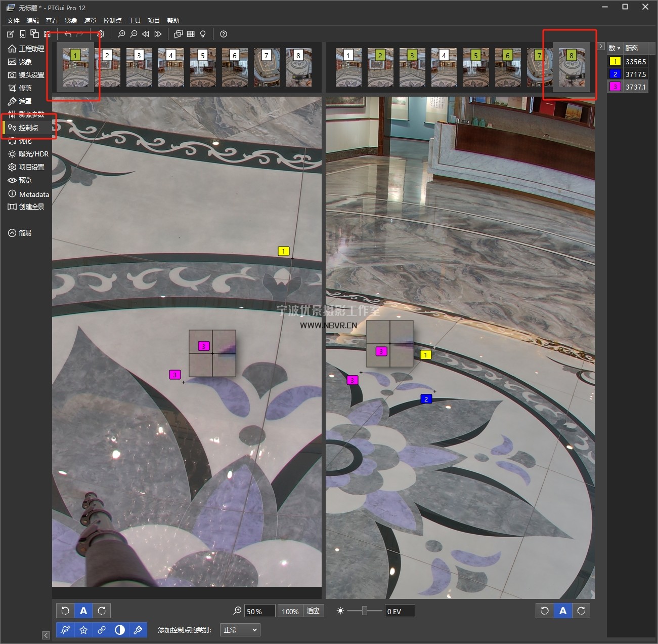 如上图:本次使用6+1+1模式拍摄,360度分6等份拍摄6张,顶部1张和地面1张。